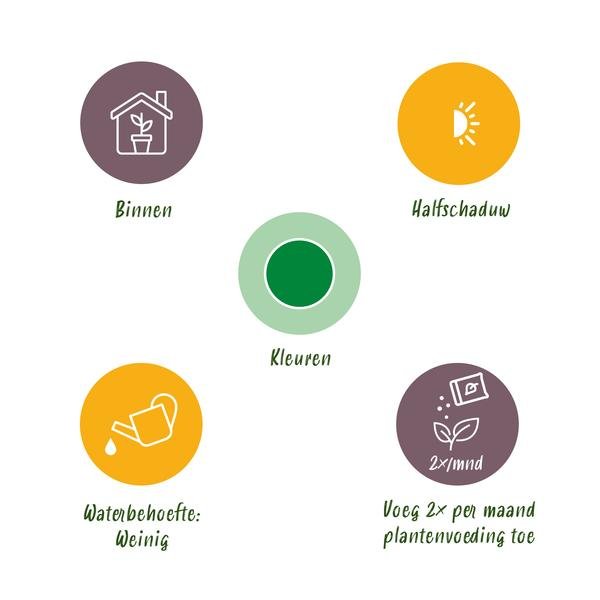 Plaats de plant op een plek met indirect licht. Direct zonlicht kan het blad beschadigen. Laat de bovenste laag van de potgrond tussen gietbeurten licht opdrogen. Vermijd langdurig natte grond.